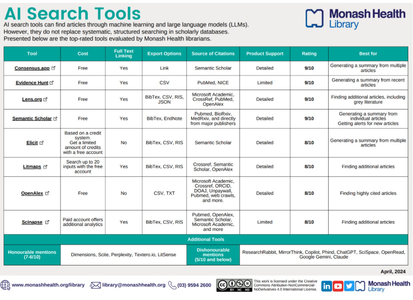 Note 3: Monash Health Library's recommended AI Tools provides a rating out of 10 for each AI and what each is best for. Background to this guide is in the article at Gorton (2025) Tech showdown - AI search tools special issue